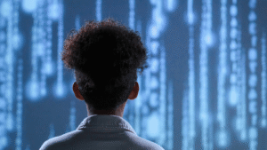 شخص ينظر إلى شلال من البيانات الرقمية، يرمز إلى أهمية تحليل البيانات الضخمة (Big Data) في مجال تخصص معلومات صحية.