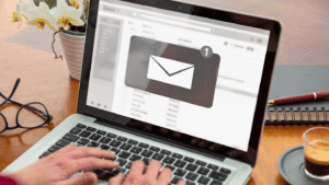 شخص يكتب على جهاز كمبيوتر محمول، حيث تظهر أيقونة بريد إلكتروني على الشاشة، ترمز إلى إرسال خطاب التقديم على وظيفة عبر الإيميل.
