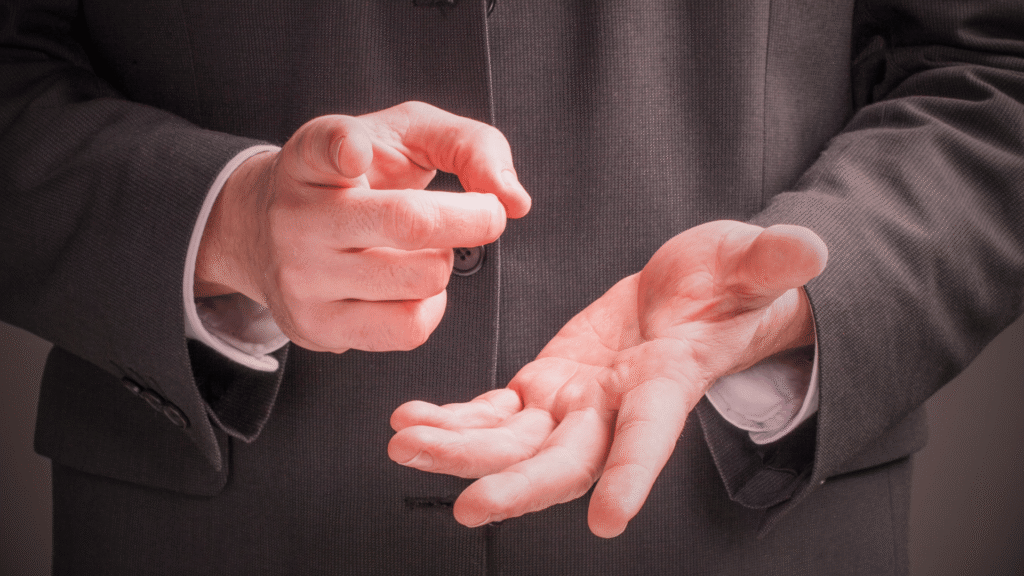 • الأسلوب الصحيح: حافظ على يديك مفتوحتين ومرئيتين. استخدم حركات اليد الطبيعية والمعتدلة للتأكيد على النقاط المهمة. حركات اليد المفتوحة والموجهة للأعلى (بطريقة لا مبالغ فيها) تظهر الصدق والانفتاح.